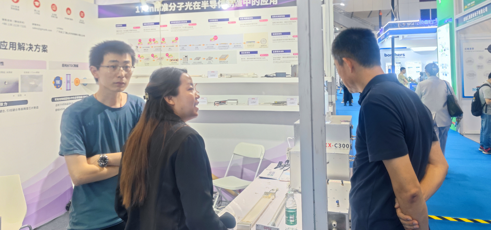 展会首日,广明源展位现场人气高涨。多家企业的研发负责人以及设备工程师等现场咨询交流,对172nm准分子光源在关键工艺中的应用表现出浓厚兴趣,并围绕不同工艺阶段对设备适配性、稳定性及量产可行性展开深入探讨。